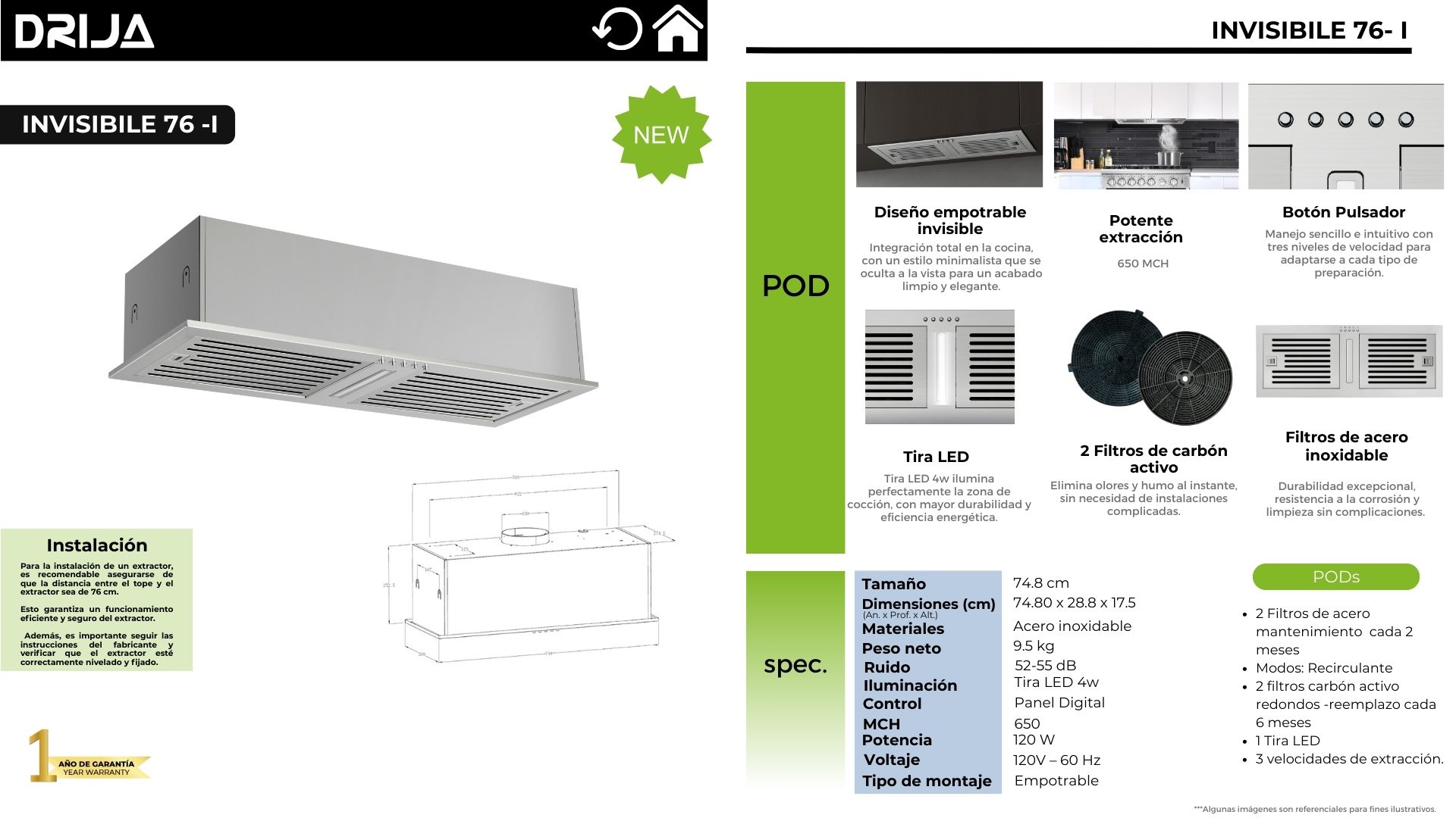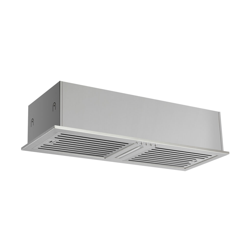 El extractor empotrable invisible INVISIBLE 76 – I se integra totalmente en la cocina para un acabado limpio y minimalista, manteniendo el área de cocción libre de humo y olores con potencia de extracción 650 MCH. Incorpora botón pulsador con 3 velocidades, tira LED 4W para iluminar la zona de cocción y un sistema de filtración eficiente con filtros de acero inoxidable y 2 filtros de carbón activo para modo recirculante. Ideal para cocinas modernas que buscan estética discreta, funcionalidad y aire más limpio.