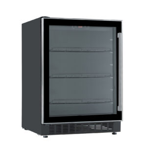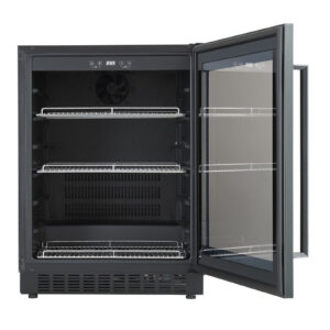 Su acabado negro con manija de acero inoxidable y puerta de vidrio doble garantizan un estilo moderno y una óptima conservación de la temperatura interna.