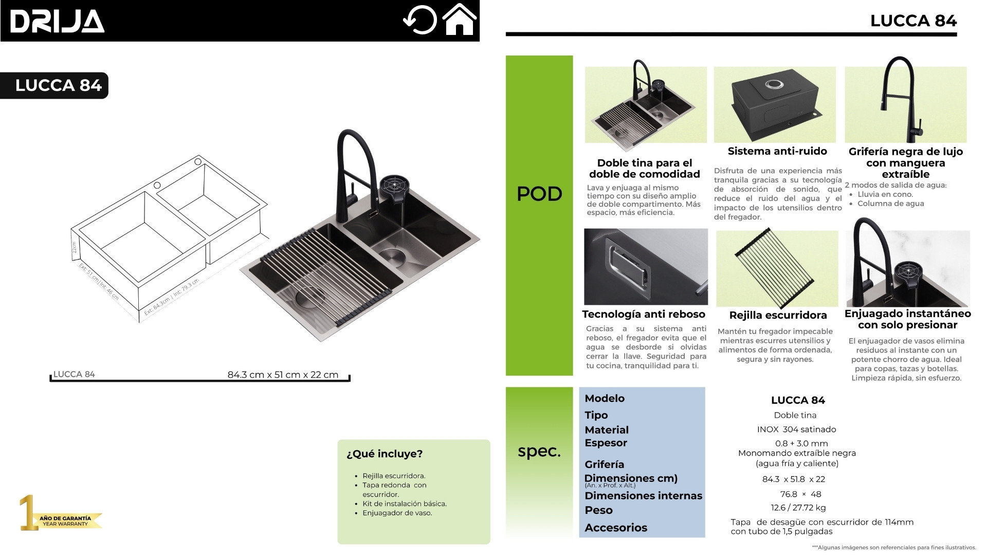 El fregador LUCCA 84 de DRIJA combina un diseño moderno con una doble tina que maximiza la funcionalidad en tu cocina. Fabricado en acero inoxidable 304 satinato con grifería negra monomando extraíble, este fregador incluye rejilla escurridora y enjuagador de vasos, elevando cada detalle de tu experiencia diaria. Su sistema anti-ruido y tecnología anti-rebose aseguran comodidad y seguridad en todo momento.