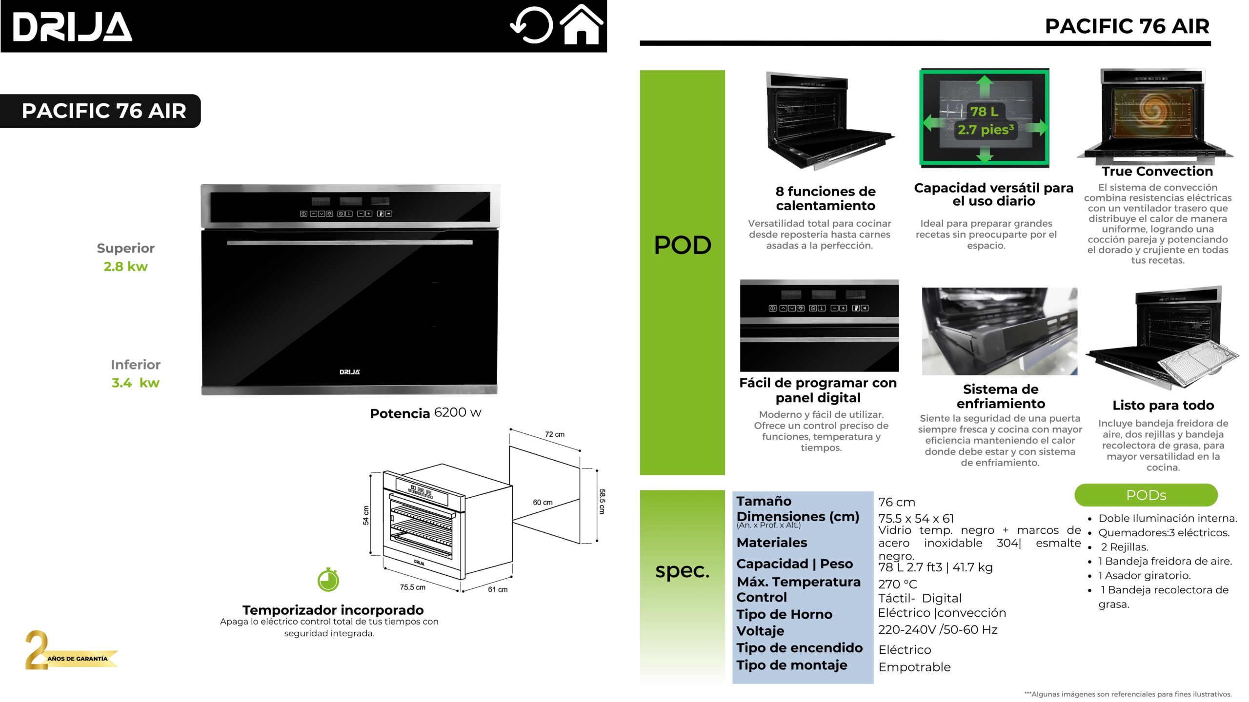 El horno empotrable Pacific 76 Air de DRIJA combina diseño moderno, panel digital y 8 funciones de calentamiento para una experiencia de cocción precisa y cómoda. Su sistema de convección con quemador garantiza acabados dorados en menos tiempo, mientras que su puerta de triple vidrio y temporizador integrado aportan seguridad y control. Con 78 litros de capacidad útil, accesorios versátiles y materiales de alta calidad, es ideal para cocinas familiares que requieren potencia y elegancia diaria.