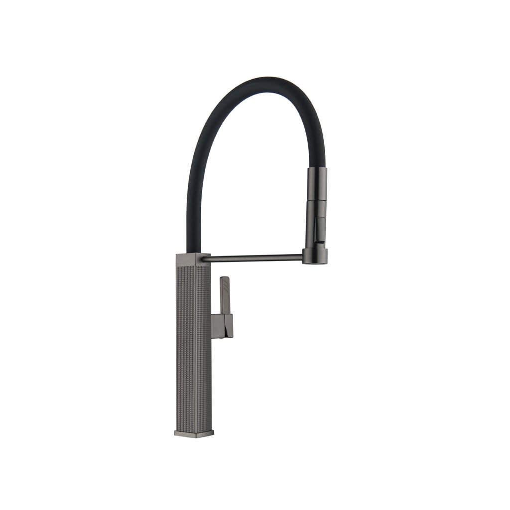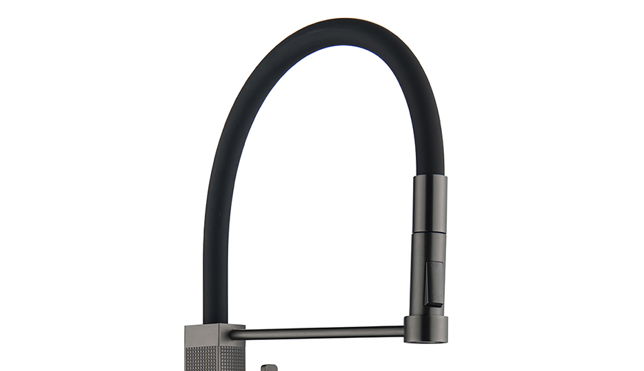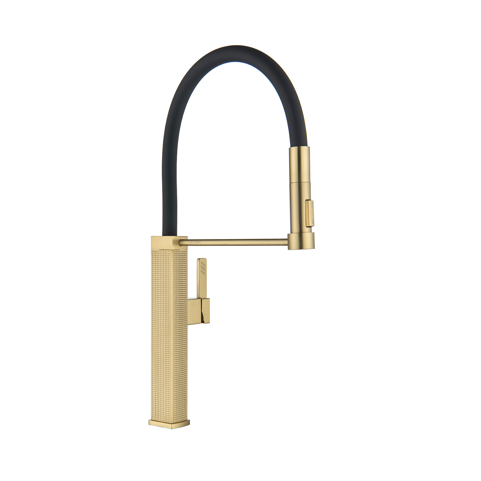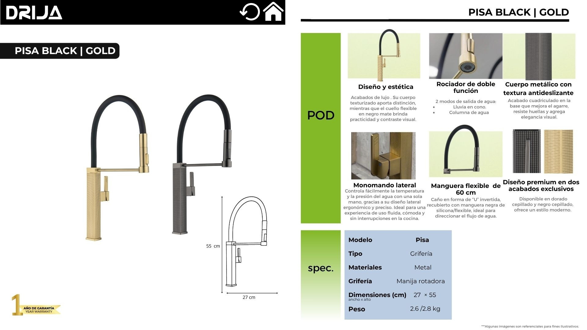 La grifería PISA BLACK | GOLD de DRIJA redefine la elegancia en la cocina con un diseño premium, cuerpo metálico texturizado y acabados exclusivos en dorado cepillado o negro mate. Su cuello flexible de 60 cm y su rociador de doble función garantizan practicidad total. El monomando lateral ergonómico brinda control preciso, mientras que la textura antideslizante realza la experiencia de uso y estilo.