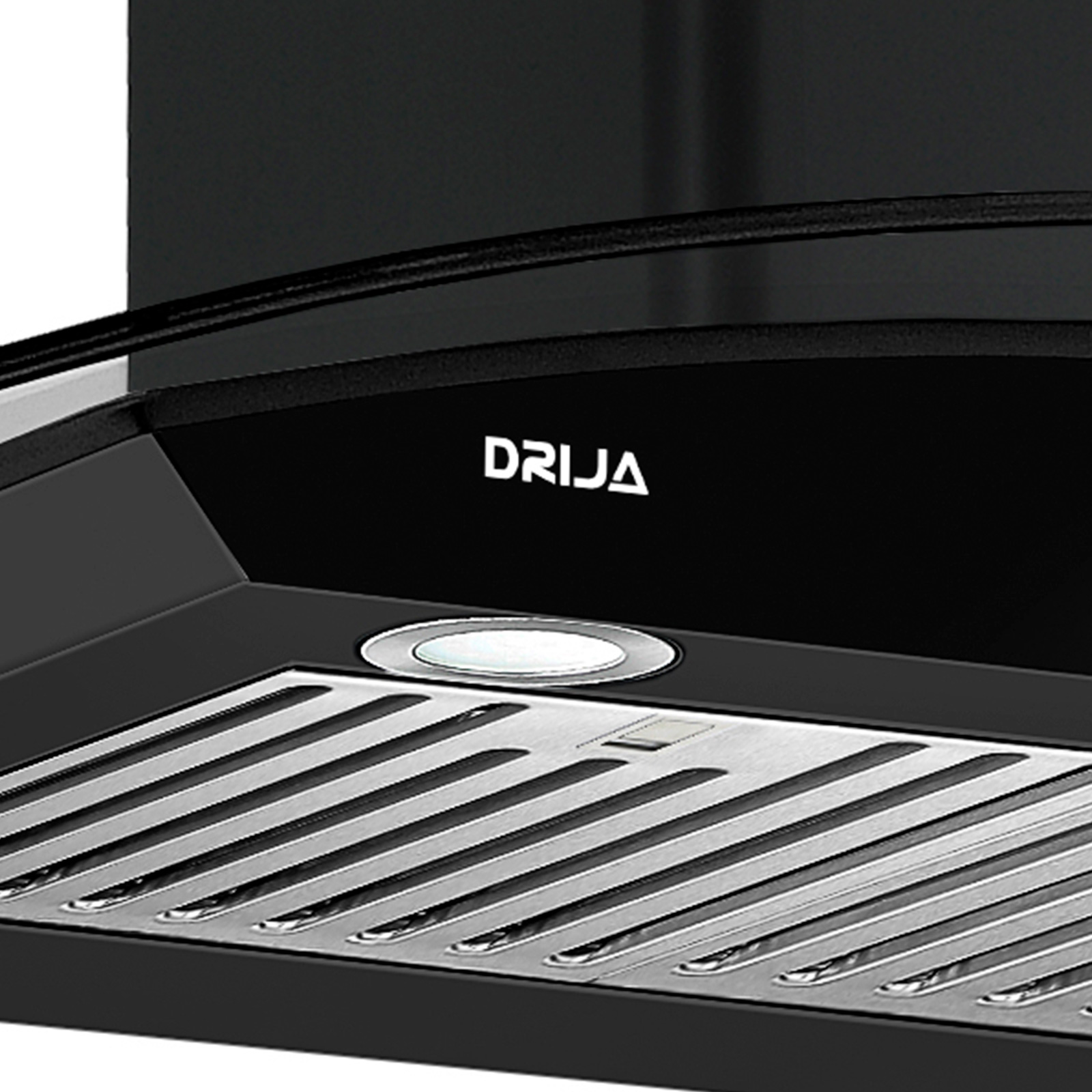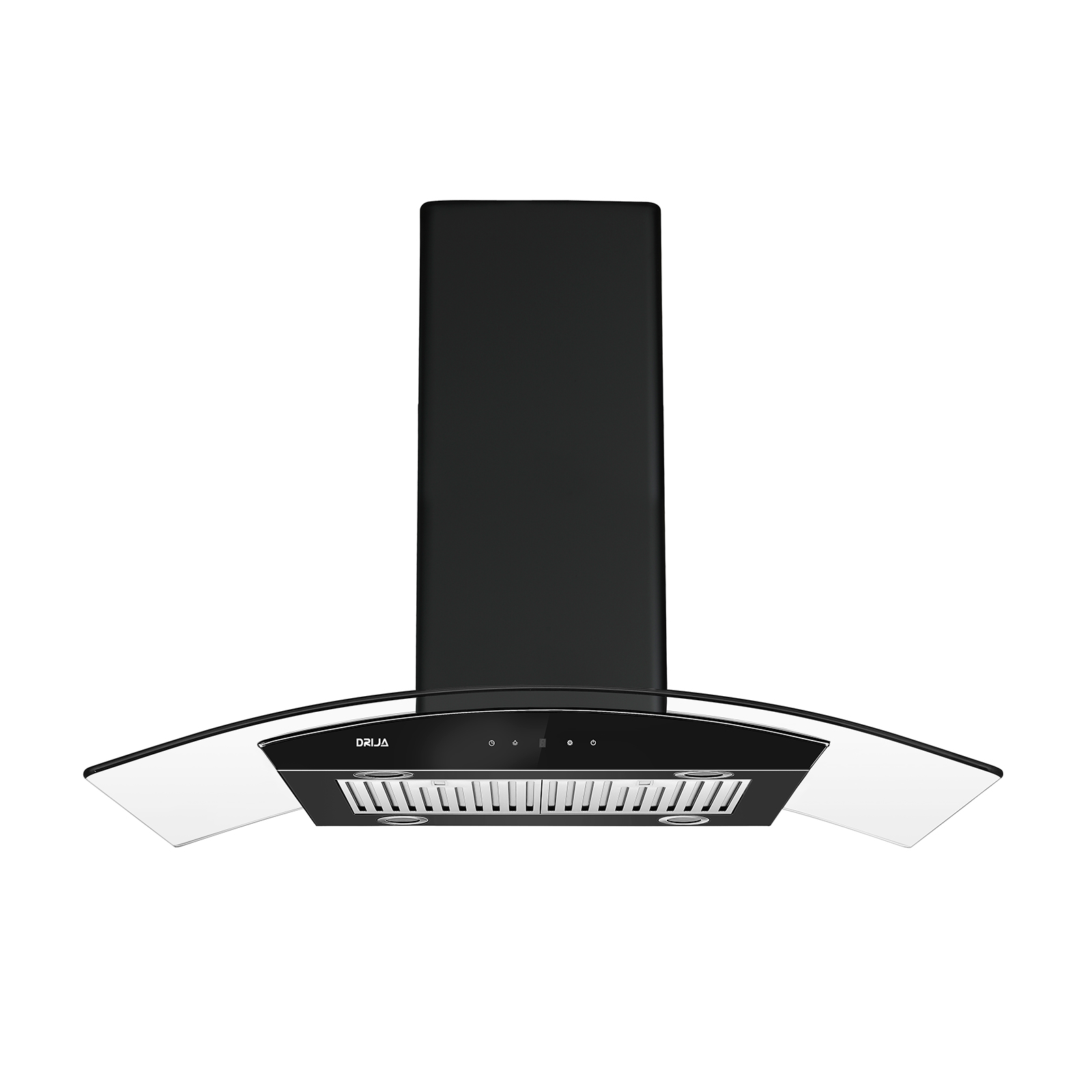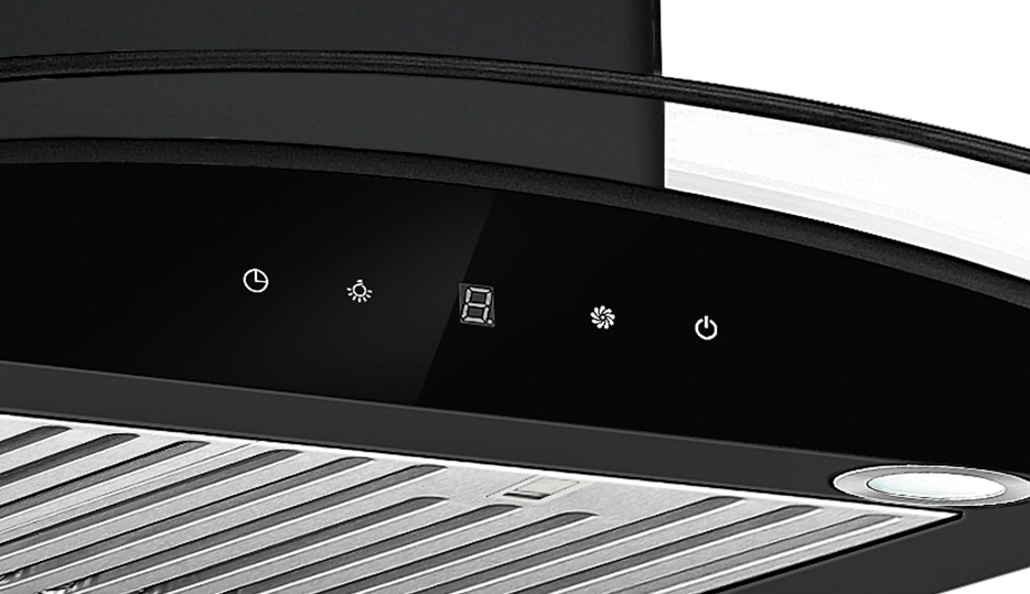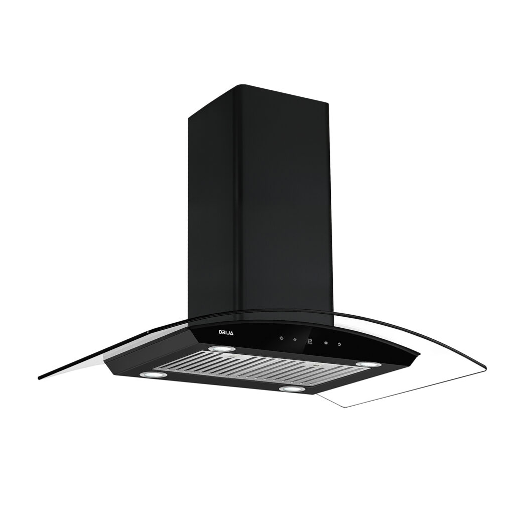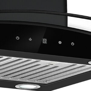 Campana extractora tipo isla de 90 cm con diseño elegante y curvo. Equipada con panel digital, filtro de carbón, sistema de filtración múltiple y 4 luces LED. Ideal para espacios abiertos, con extracción potente y silenciosa.