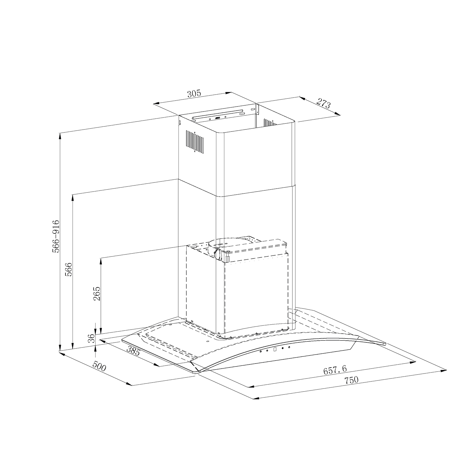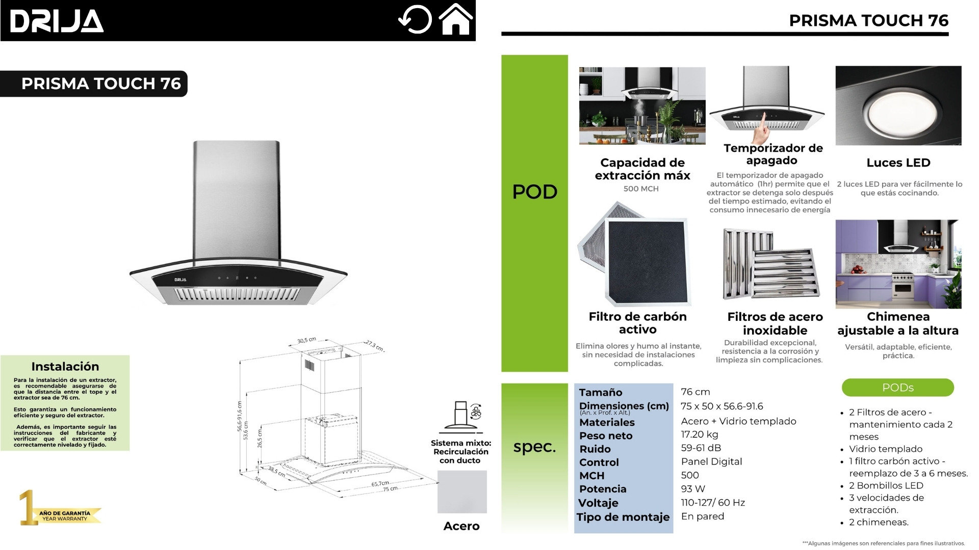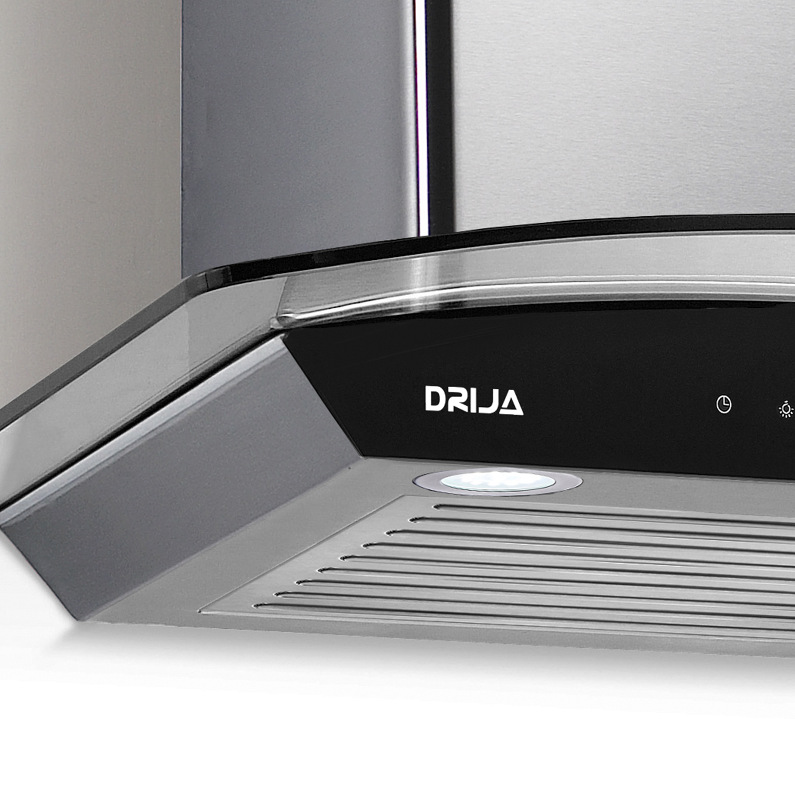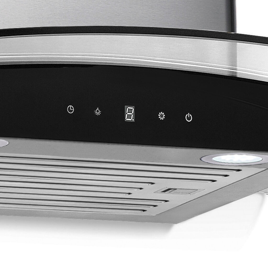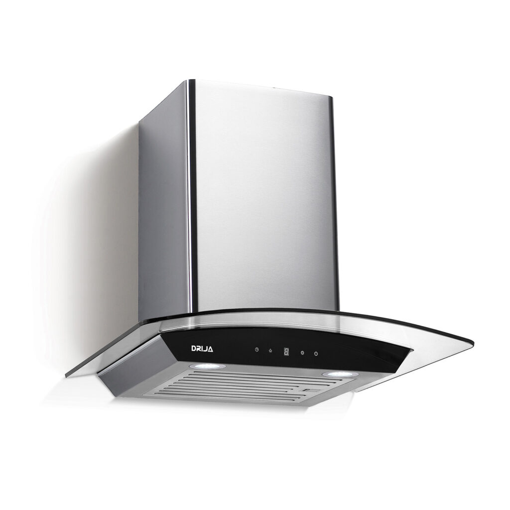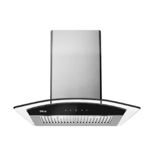 Campana decorativa de 76 cm con diseño curvo en acero y vidrio templado. Equipada con panel digital, triple filtración y alta eficiencia de extracción, ideal para cocinas modernas y funcionales.