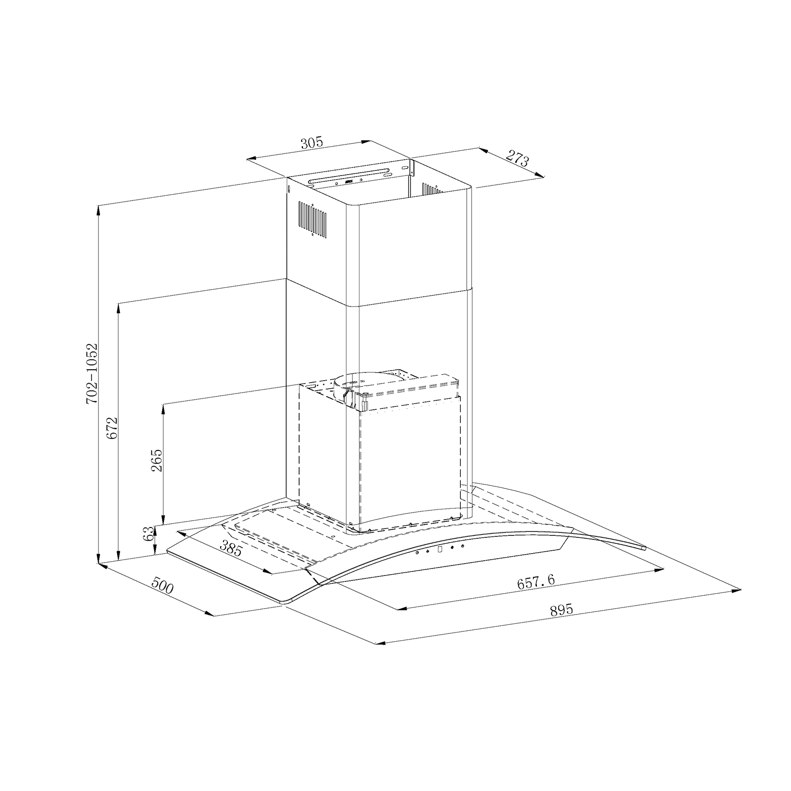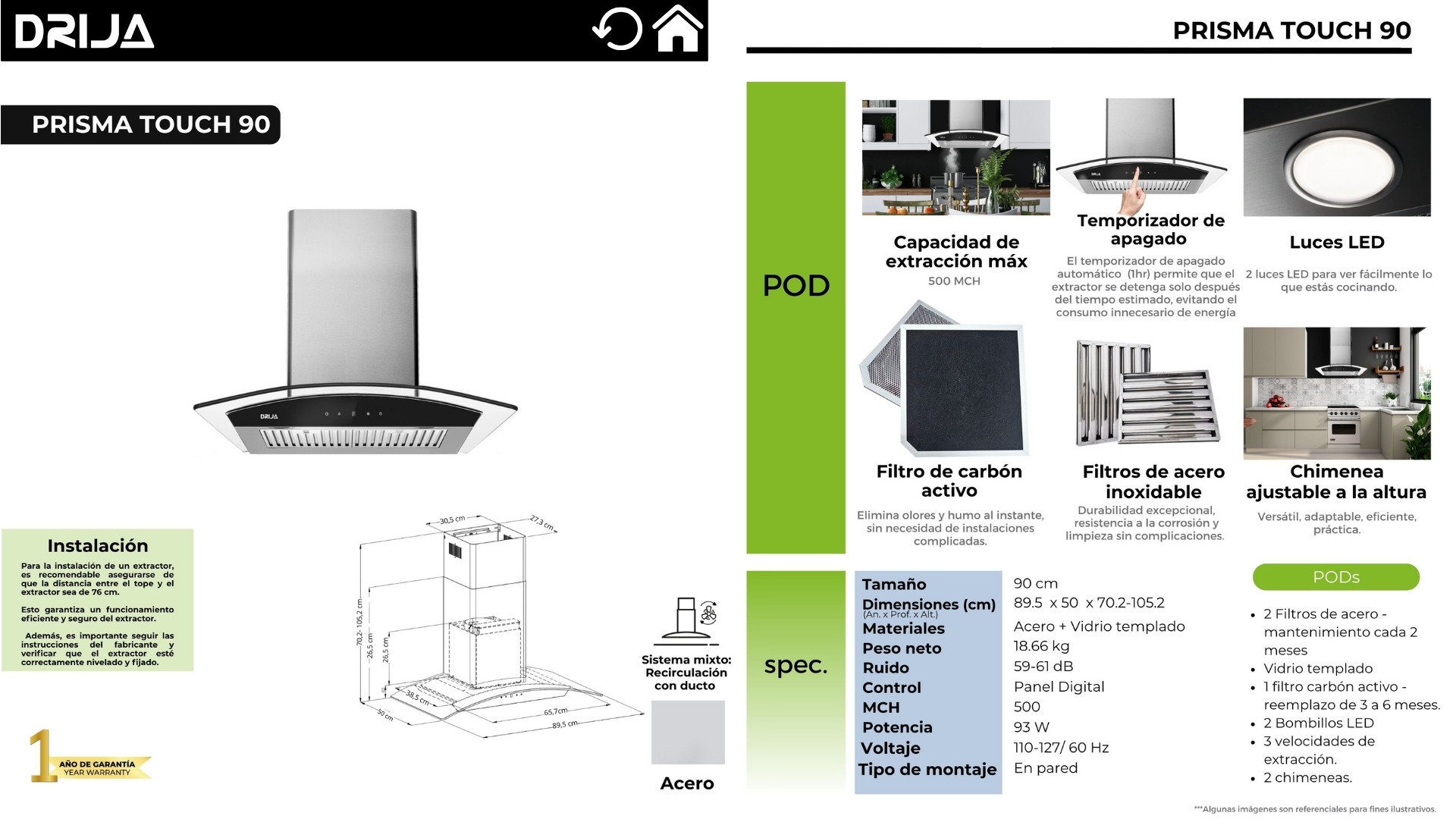 Campana decorativa de 90 cm con diseño curvo en acero y vidrio templado. Equipada con panel digital, triple filtración y alta eficiencia de extracción, ideal para cocinas modernas y funcionales.