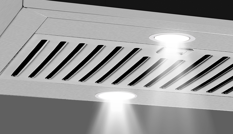 Con 4 luces LED estratégicamente distribuidas, esta campana tipo isla ofrece una iluminación amplia y uniforme, ideal para cocinas abiertas y espacios grandes.