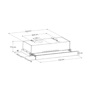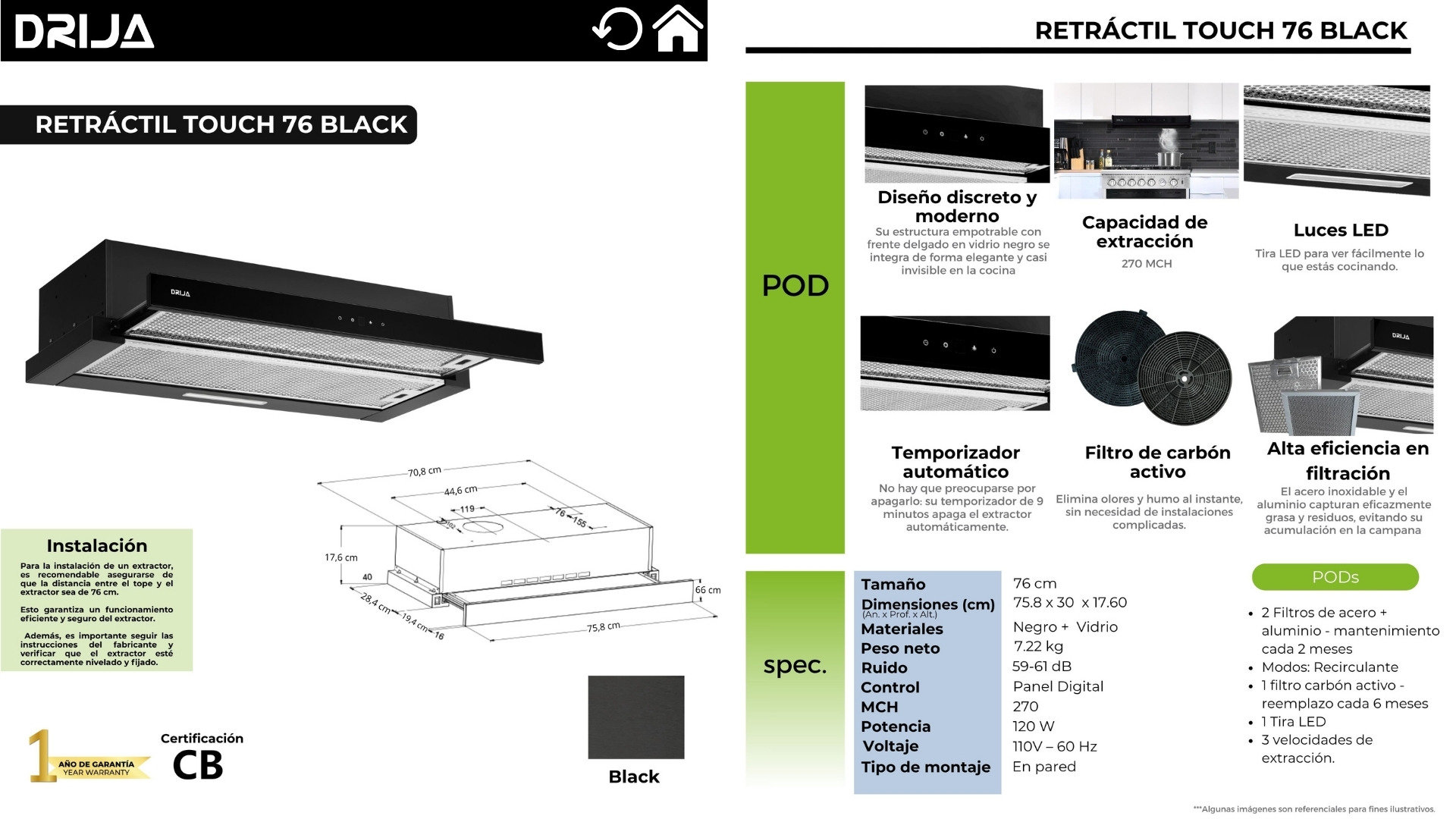 Campana retráctil de 76 cm con panel digital táctil y temporizador automático. Cuenta con línea LED, sistema de filtrado en acero + aluminio, filtro de carbón activo y diseño eficiente para instalaciones discretas.