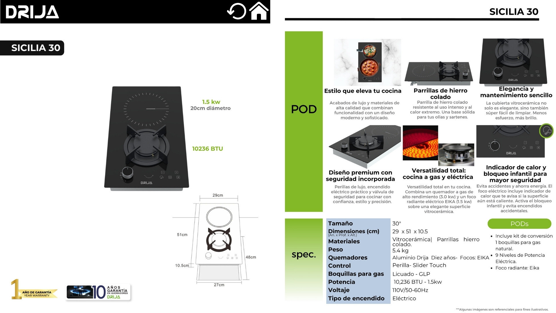 | Quemadores | 1 gas (10,000 BTU) + 1 eléctrico (1.5 kW) |