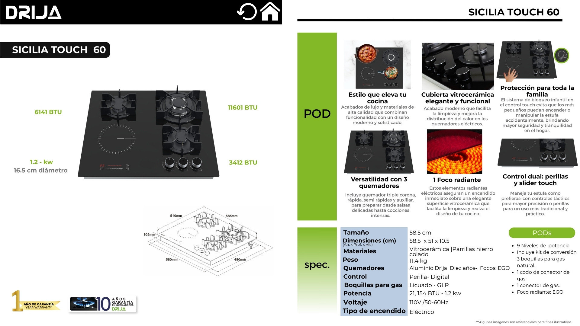 La Sicilia Touch 60 es una estufa empotrable híbrida ideal para cocinas pequeñas o medianas. Con 3 quemadores a gas y un foco radiante eléctrico EGO, combina tecnología moderna, control dual (perillas + touch) y funciones de seguridad avanzadas como el bloqueo infantil, en un diseño elegante y compacto de vitrocerámica.