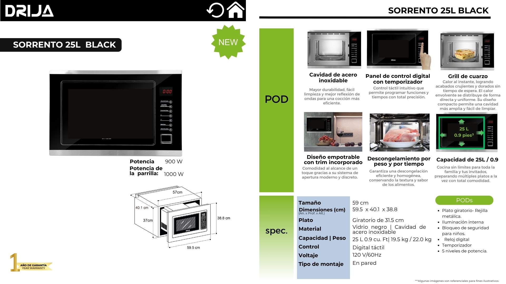 El microondas empotrable Sorrento Black 25L de Drija ofrece tecnología moderna, estilo sofisticado y funcionalidad intuitiva. Equipado con grill de cuarzo, panel digital con temporizador y cavidad interior en acero inoxidable, este modelo destaca por su diseño “trim” con apertura por botón, ideal para cocinas elegantes y prácticas.