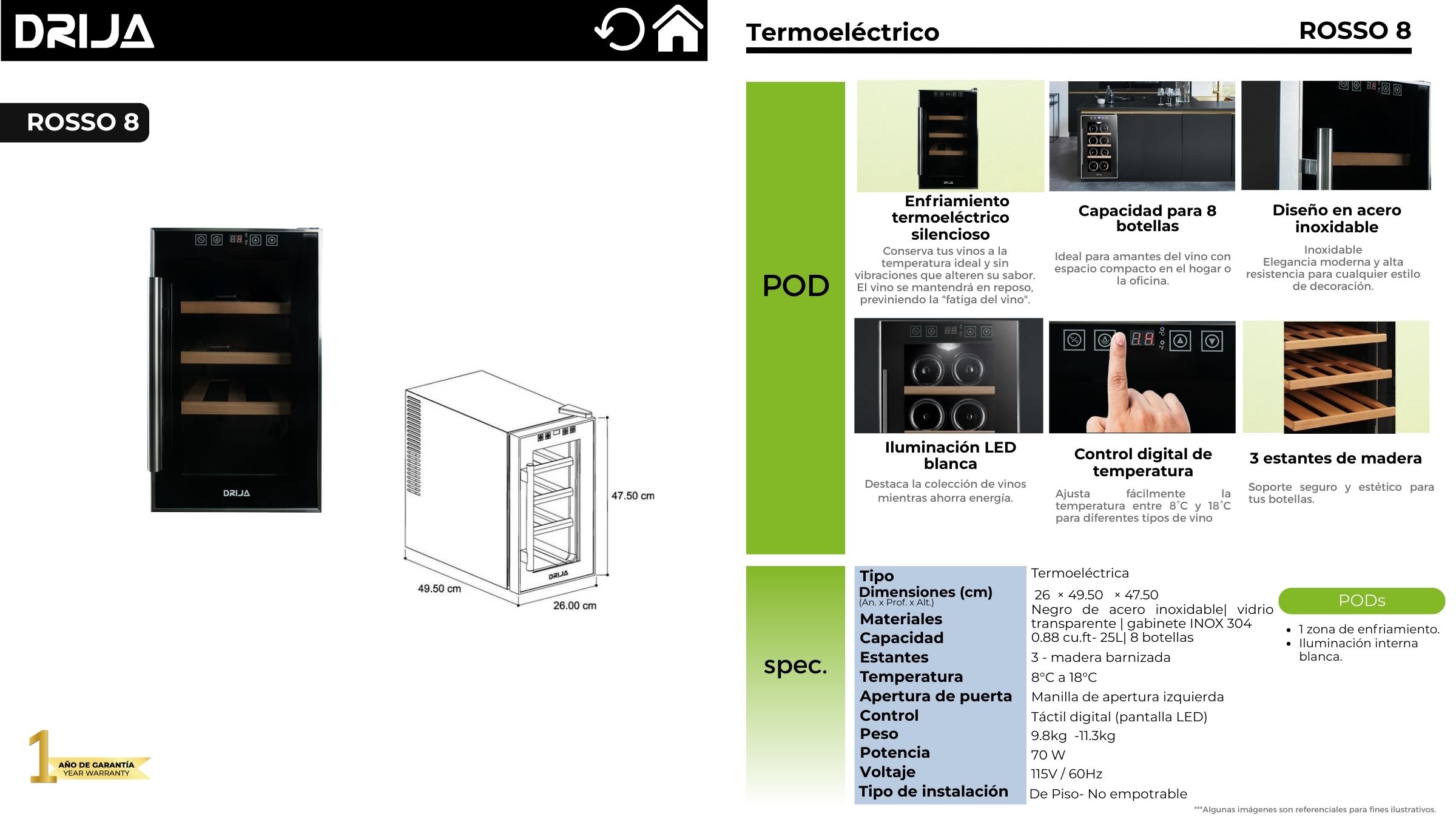 La vinera Tempranillo 8 de DRIJA ofrece conservación profesional para tu colección de vinos gracias a su sistema de enfriamiento por compresor, ideal para mantener la temperatura entre 5 °C y 20 °C con precisión. Su diseño compacto en acero inoxidable, puerta reversible y capacidad para 8 botellas la convierten en una opción perfecta para hogares, oficinas o espacios gourmet. Además, cuenta con iluminación LED azul, estantes de madera y garantía extendida de 10 años en el compresor.