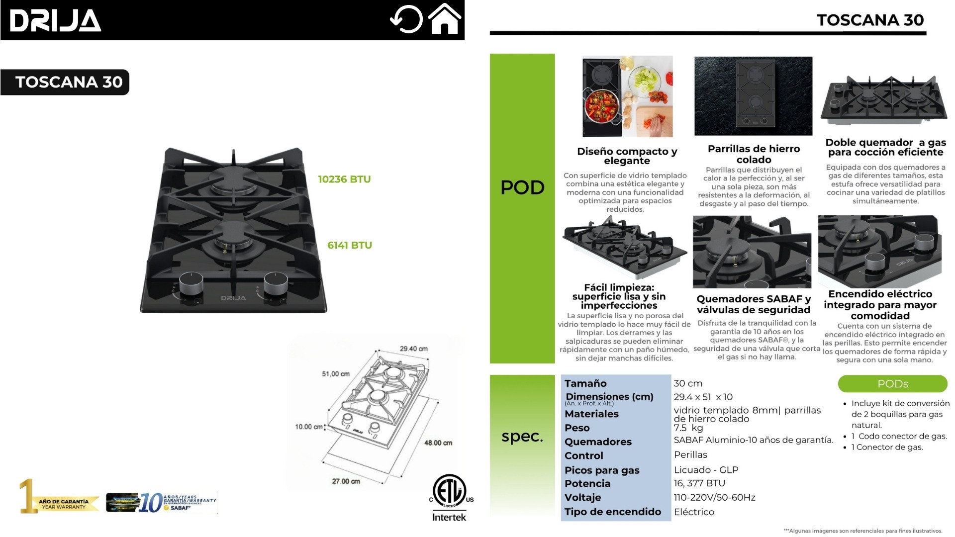 La Toscana 30 cuenta con un quemador de 10,000 BTU para ebulliciones rápidas y un quemador de 6,000 BTU para cocciones lentas y precisas. Esta combinación te ofrece la versatilidad necesaria para preparar tus recetas favoritas con eficiencia.
