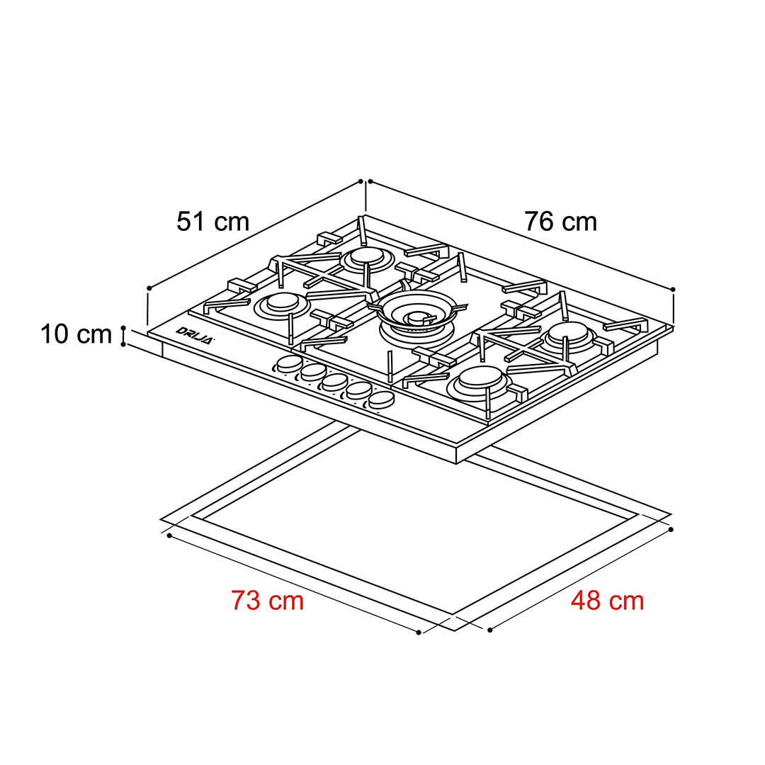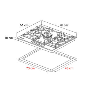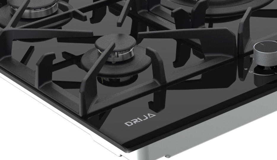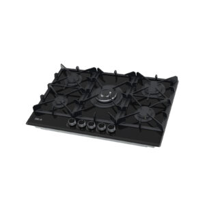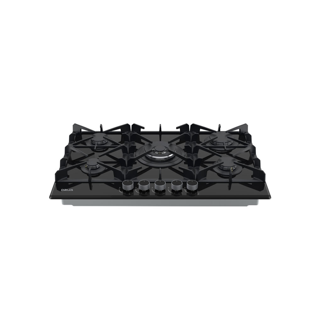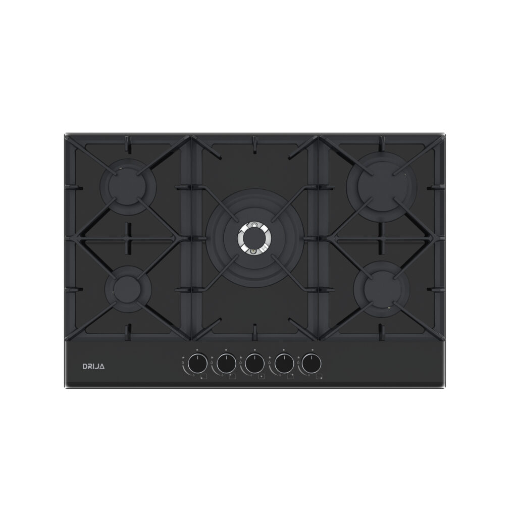 Estufa de 76 cm con elegante superficie de vidrio templado negro de 8 mm, equipada con cinco quemadores SABAF de alta eficiencia y plancha de hierro fundido. Ideal para quienes buscan funcionalidad y sofisticación en espacios medianos.