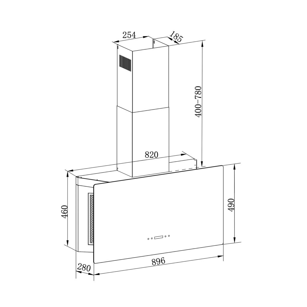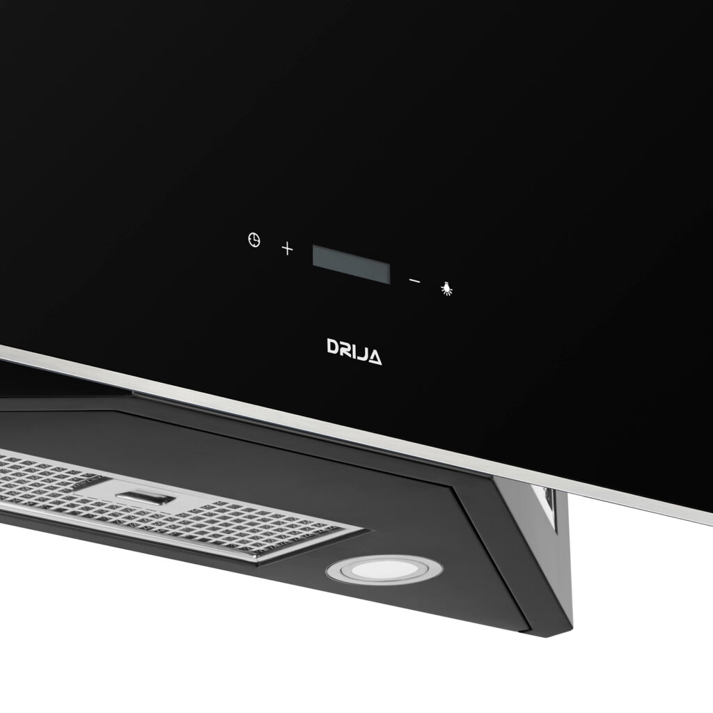 Campana decorativa de 90 cm en vidrio negro templado con bordes de acero. Potente sistema de extracción con triple filtrado, panel digital y diseño moderno inclinado. Ideal para una cocina funcional y elegante.