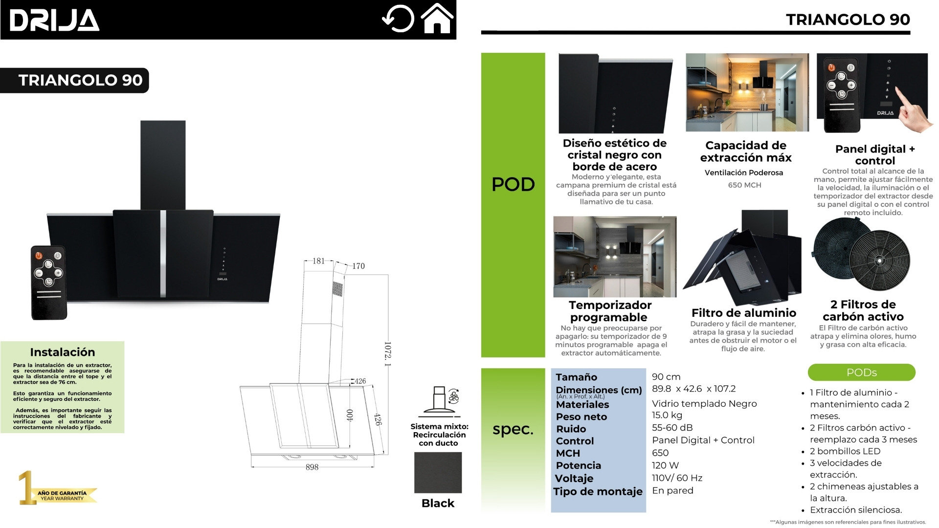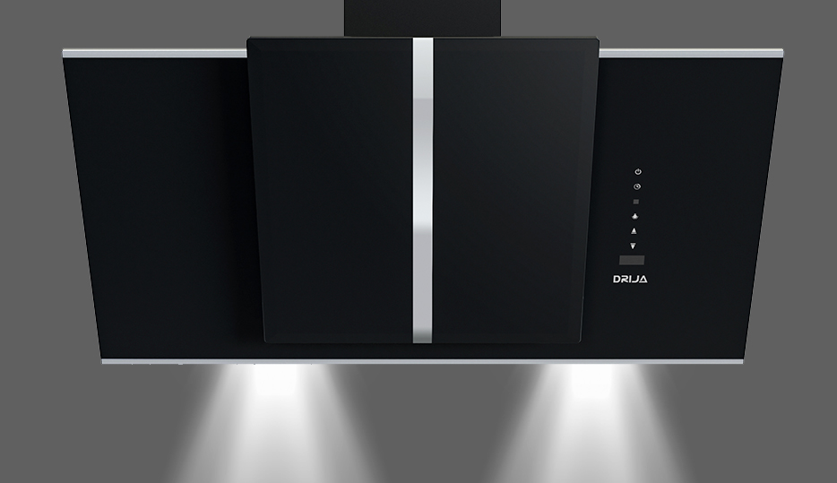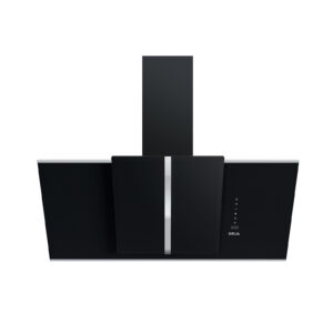 Campana de gran tamaño (90 cm) para cocinas amplias. Integra vidrio templado negro con bordes de acero, temporizador digital, 3 velocidades y doble sistema de filtrado.