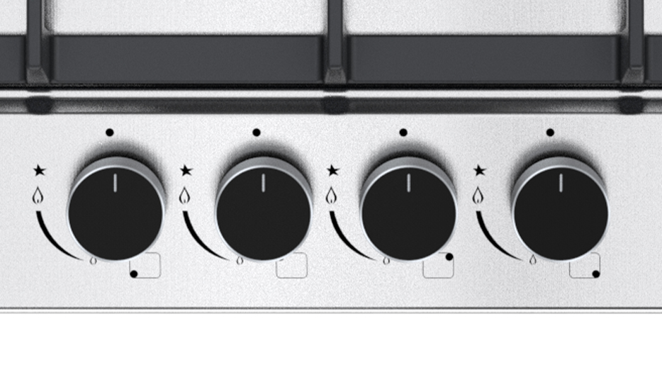 Estufa empotrable de 60 cm con cubierta en acero inoxidable y parrillas de hierro colado. Ofrece 4 quemadores de diferentes intensidades, sistema de válvulas de seguridad y diseño compacto ideal para cocinas funcionales y modernas.
