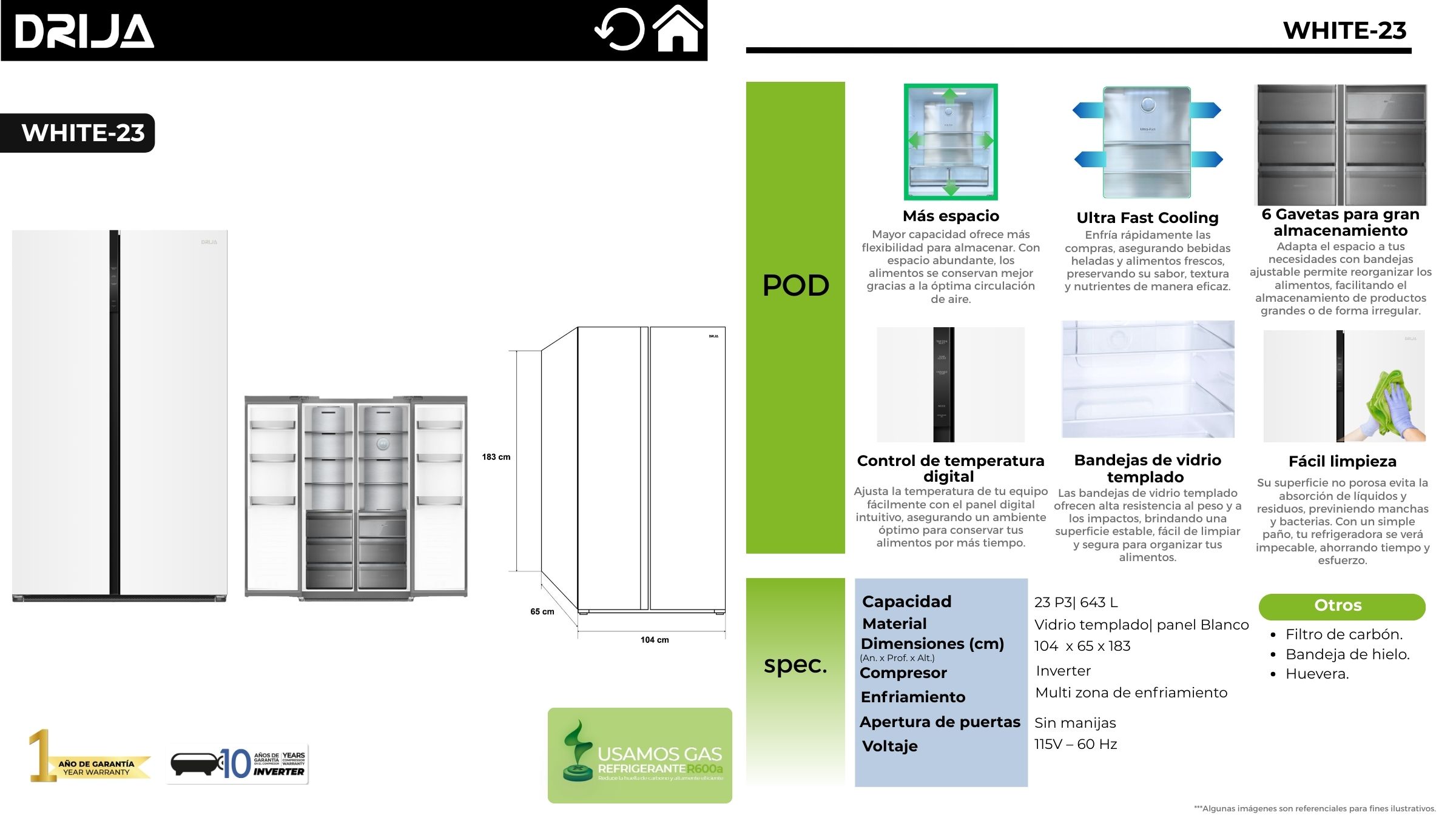 El refrigerador WHITE-23 de DRIJA combina elegancia y capacidad con su acabado en vidrio templado blanco y amplio espacio de 23 P³ / 643 L. Diseñado para brindar máxima organización, cuenta con 6 gavetas de gran almacenamiento, bandejas de vidrio templado resistentes y fáciles de limpiar, y control de temperatura digital para un manejo preciso. Su tecnología Multi zona de enfriamiento con Ultra Fast Cooling conserva los alimentos frescos por más tiempo. Incluye filtro de carbón y accesorios para una experiencia de uso completa.